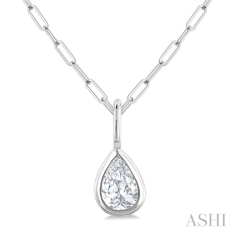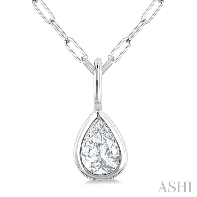 Elevate any ensemble with the simple charm and allure of this diamond fashion pendant, which makes a good addition to your everyday accessories. It features an attractive pear-shaped design mount, with a radiant pear cut diamond bezel set within it. The sleek and contemporary pear-shaped silhouette accentuates the brilliance of the pear-cut diamond, while the secure bezel setting adds a touch of modernity to it. Complemented by an 18-inch 1.05MM Paperclip chain, both framed in a polished rhodium finish 10 karat white gold, this diamond fashion pendant offers a versatile and chic look that effortlessly transitions from day to night. Total diamond weight is 1/5 Ctw.