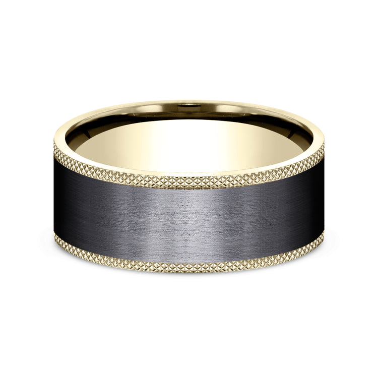 9mm, Comfort fit14K Yellow Gold and Black TitaniumSatin finish center, knurl detailed edges