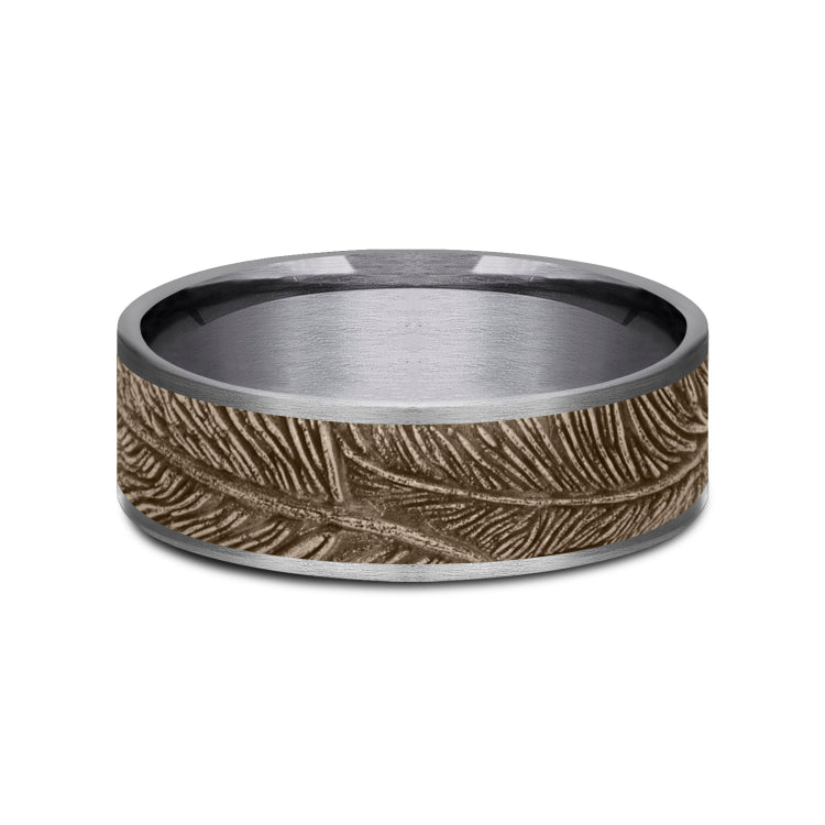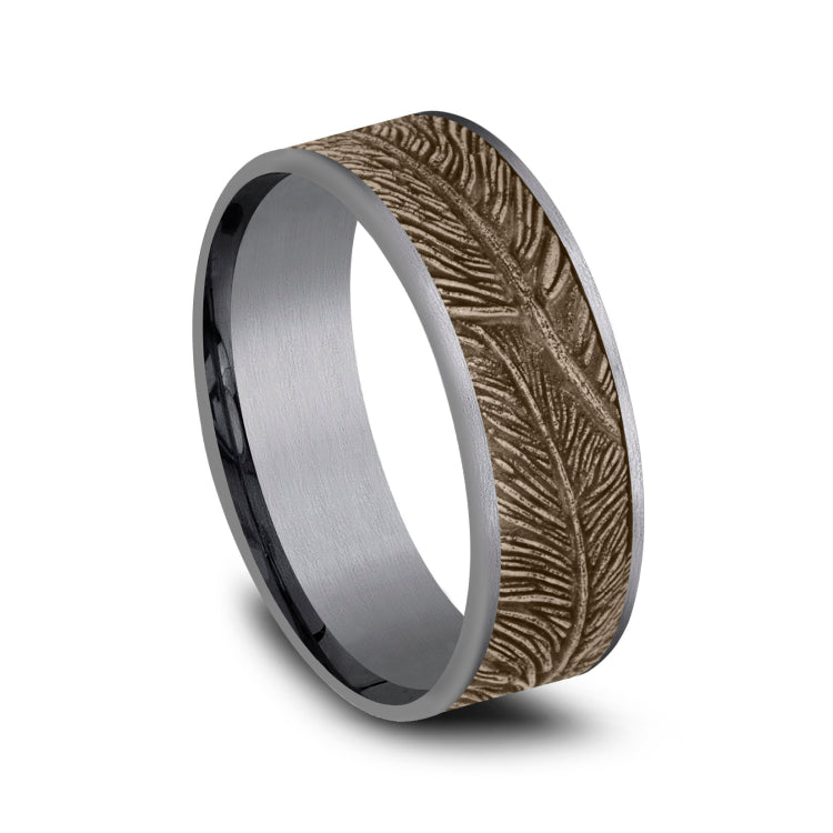 7.5mm, Comfort fitGrey Tantalum and 14K Rose GoldFeather pattern, thin edges