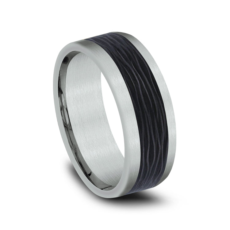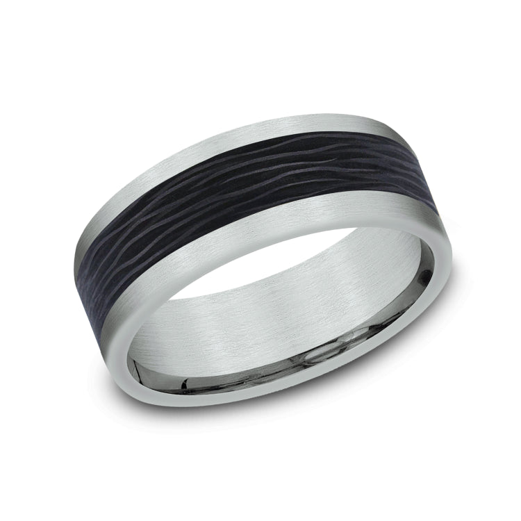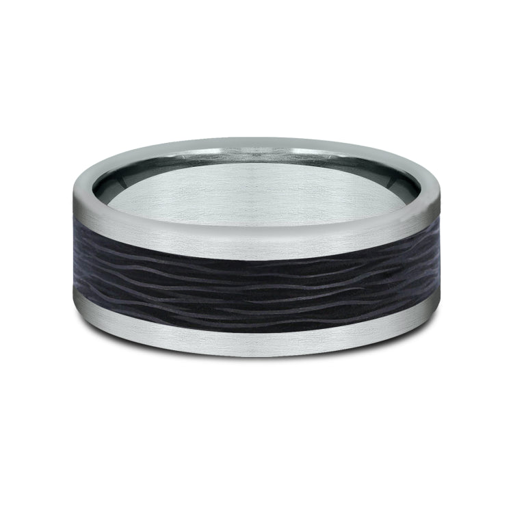 8mm, Comfort fit14K White Gold and Forged Carbon FiberForged carbon fiber center, thick straight edges