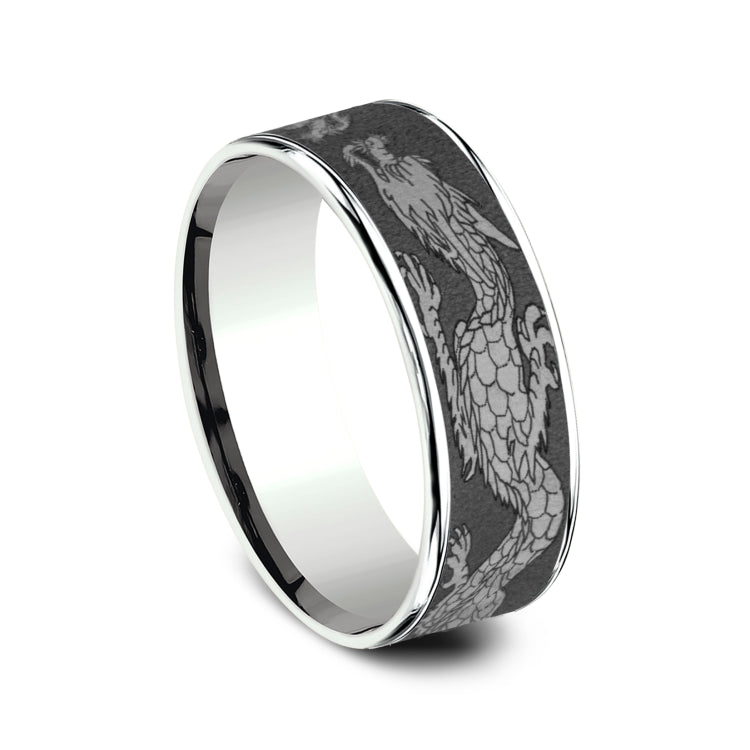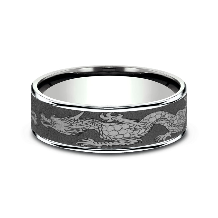 7.5mm, Comfort fit14K White Gold and Darkened TantalumChinese dragon patterened center, thin edges