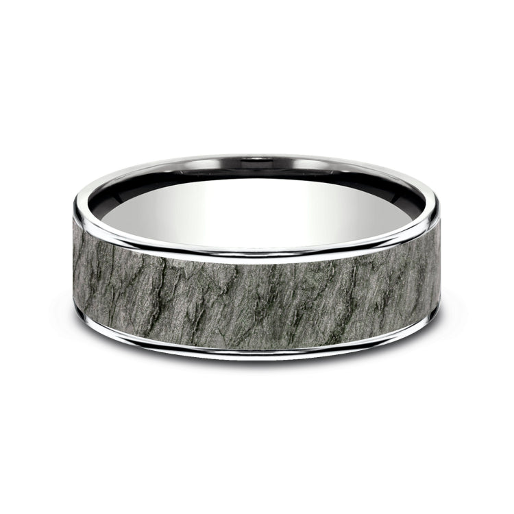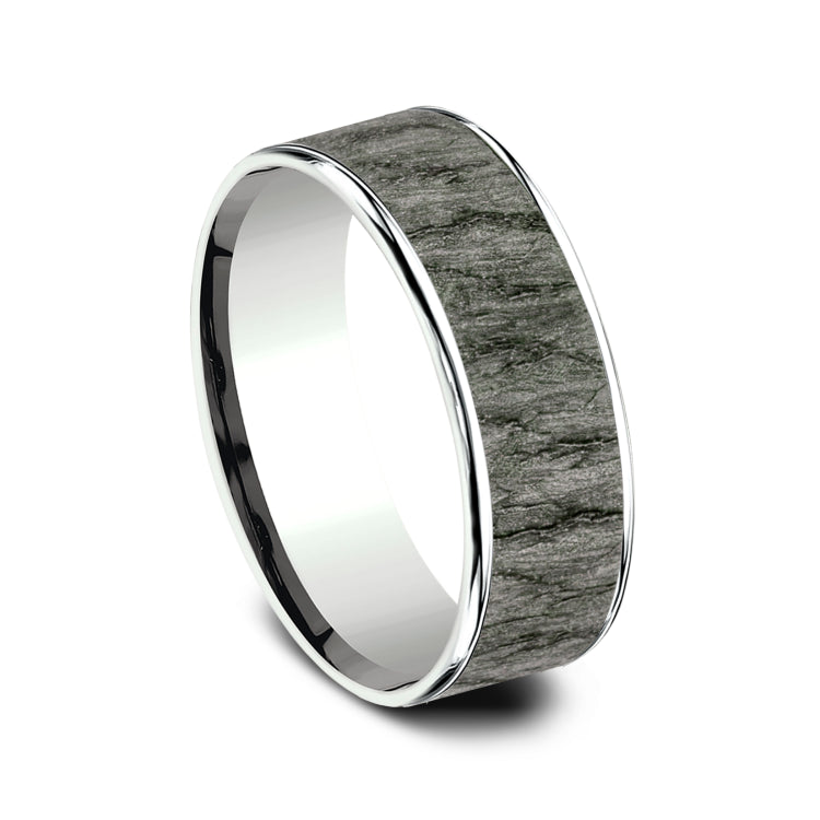 7.5mm, Comfort fit14K White Gold and Grey TantalumLava rock textured center, polished thin edges