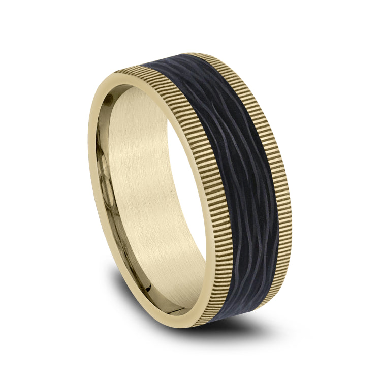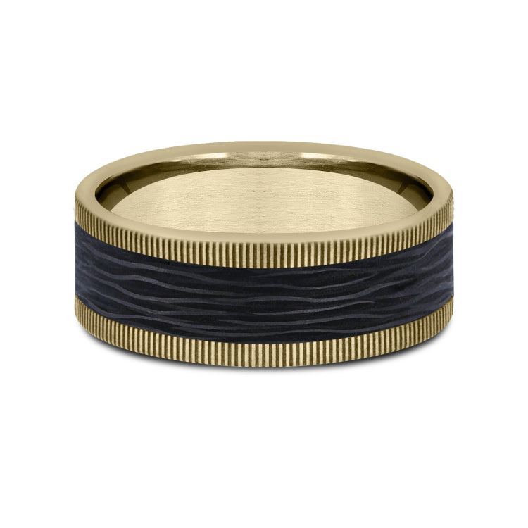 8mm, Comfort fit14K Yellow Gold and Forged Carbon FiberForged carbon fiber center, thick coin edges