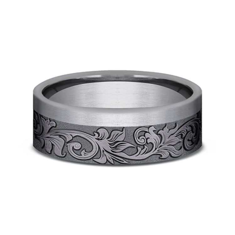 7mm, Comfort fitGrey and Darkened TantalumVintage script pattern