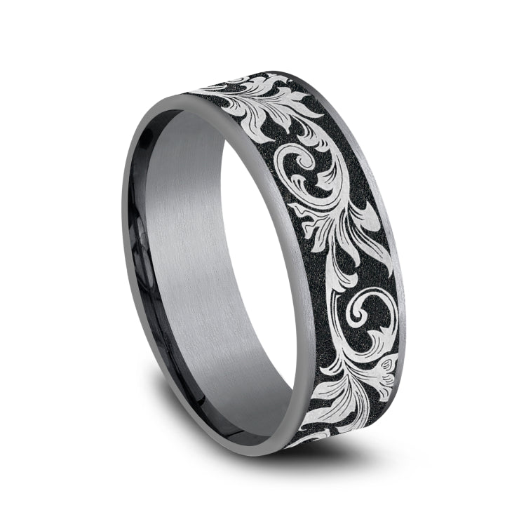 7.5mm, Comfort fitGrey Tantalum and Grey/Black TitaniumVintage script pattern, thin edges