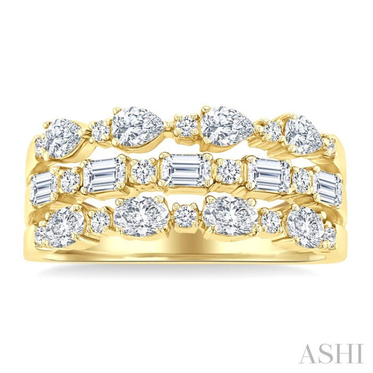A gorgeous diamond fashion band, this offers stunning appeal. It features a split shank triple row layout of diamonds cut in different shapes. Embellishing the middle row are 5 fancy set emerald cut diamonds, with 4 prong set round cut diamonds separating them, 1 each between the emerald cut diamonds. Decorating the exterior rows is 4 each, total 8, fancy set pear cut and oval cut diamonds on each row respectively, with 1 each prong set round cut diamond, total 8, nestled between them. The diamond fashion band is crafted in 14 karat yellow gold. The total diamond weight is 1 1/2 Ctw.