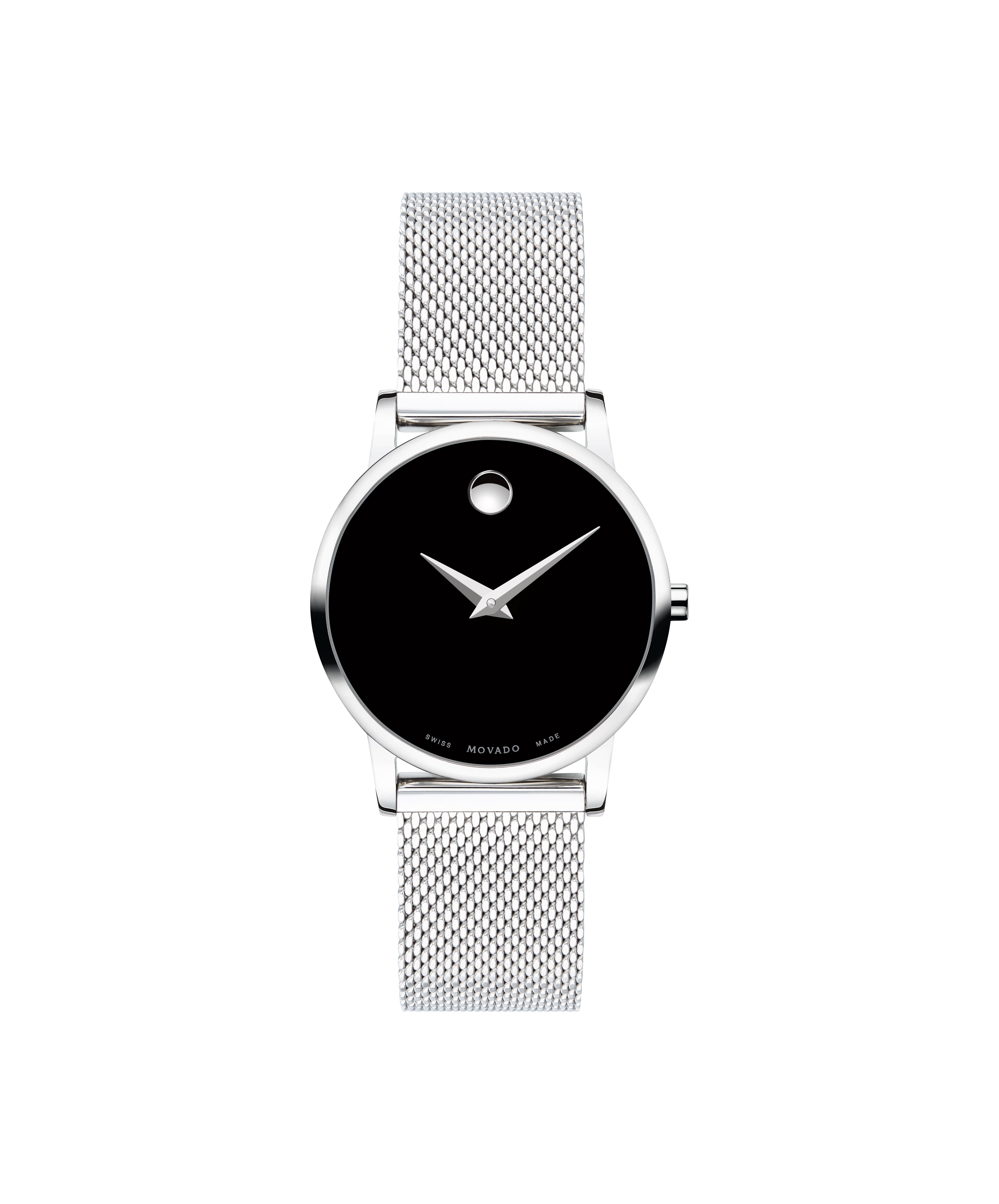 Women's Museum Classic watch, 28 mm stainless steel case, black Museum dial and silver-toned dot and hands, stainless steel mesh bracelet with sliding closure clasp.