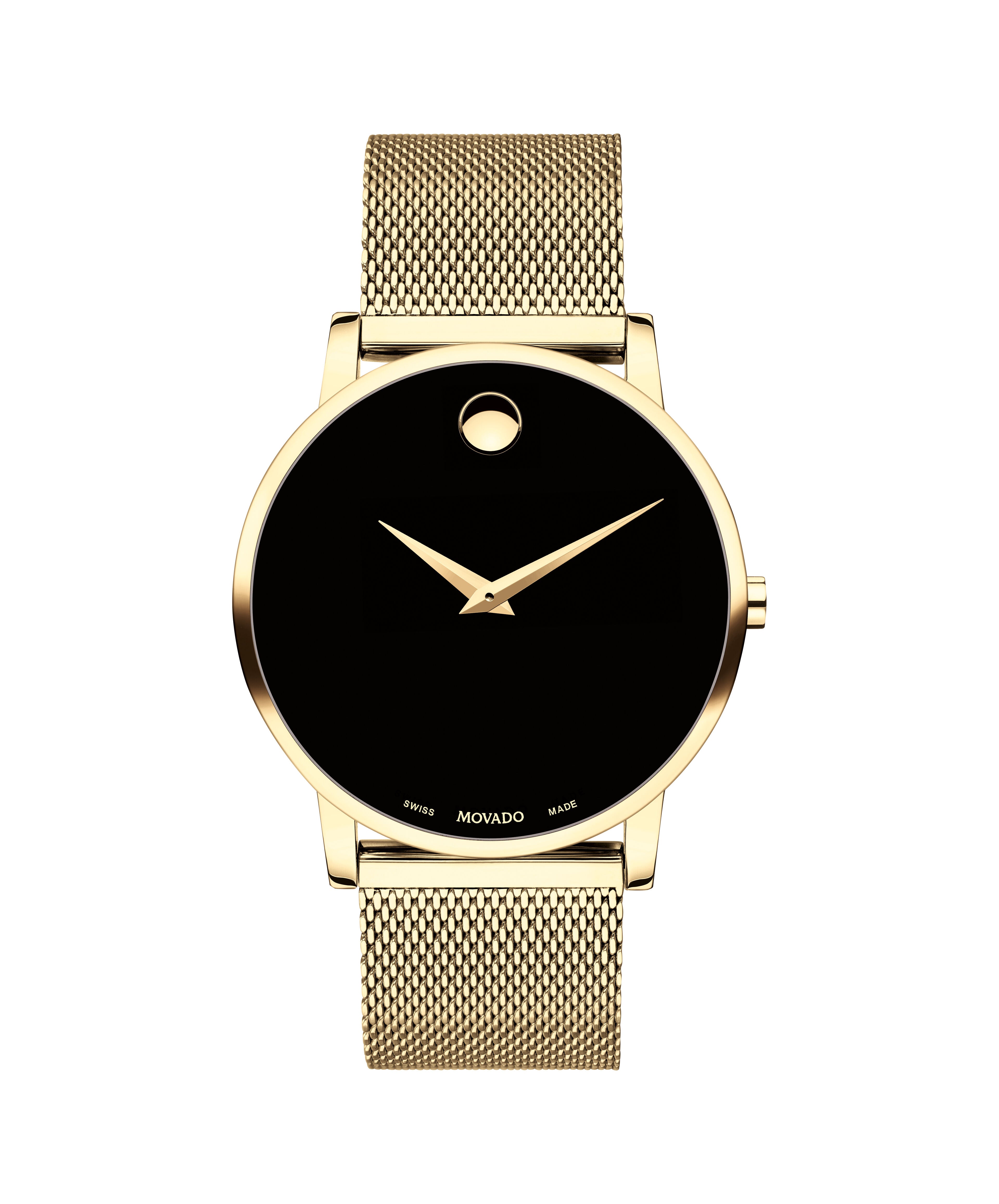 Movado Museum Classic, 40mm yellow gold PVD-finished stainless steel case and mesh bracelet with a black-toned dial.