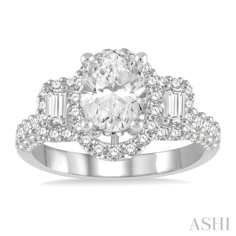 An awesome diamond semi-mount engagement ring that also gives you the option to choose a center stone for it, suiting your budget. It features a tri-mount centerpiece, with a raised oval shape border mount in the center, flanked by a rectangular mount each on a lower level. The oval center mount showcases a prong raised middle, where an oval cut center stone of 1 Ctw to 1.40 Ctw of your choice gets installed. Pre-adorned on the oval border mount is 18 prong set round cut diamonds. The rectangular mounts are embellished with a fancy set baguette diamond each, bordered by 8 each prong set round cut diamonds. 5 each prong set round cut diamonds, total 10, accent the shank on either side. 25 each, total 50, prong set round cut diamonds decorate the interior arch at the front and back with milgrain finish. The ring is crafted in 14 karat white gold. Total diamond weight is 7/8 Ctw.