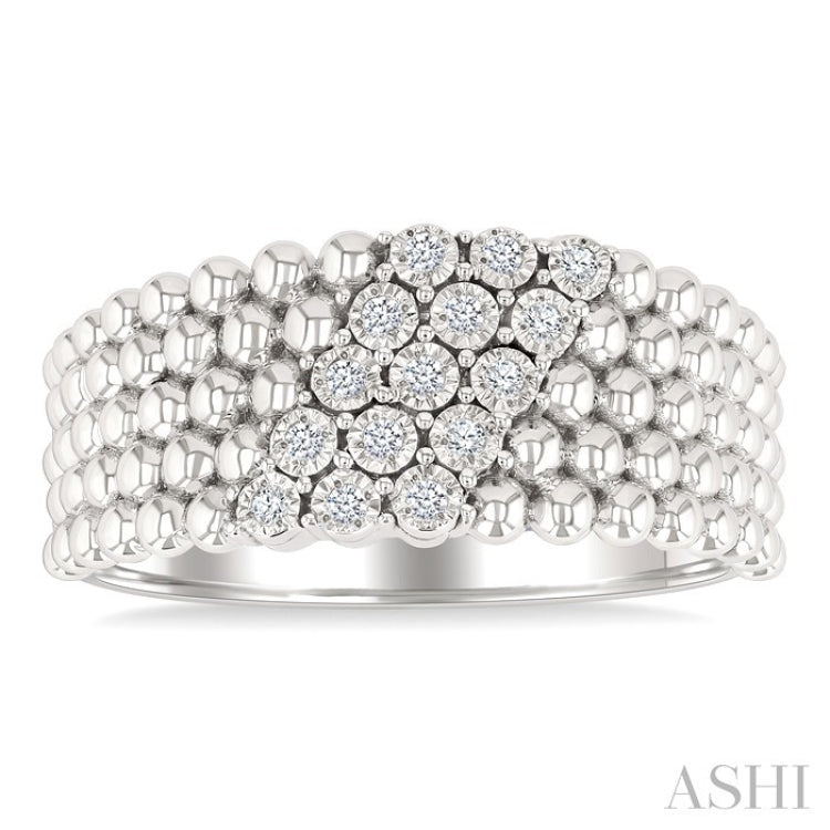 Bold by design and rich in texture, this diamond fashion ring makes a contemporary statement. A wide band structure highlights a striking centerpiece, three slanted rows of diamonds, each with 5 pave hand set round cut diamonds, total 15, forming a shimmering diagonal trio. Framing this brilliance on both sides are five tightly arranged rows of smooth silver ball beads, adding bold dimension and modern flair. Designed in rhodium finish silver, the diamond fashion ring blends sleek polish with sculptural elegance. Total diamond weight is 1/10 Ctw.