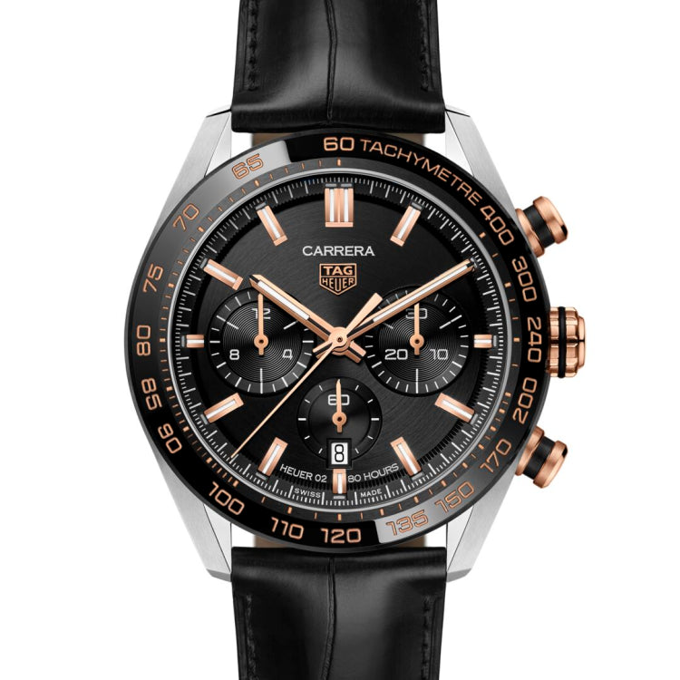 A chic black and rose gold Carrera with a 44-mm steel polished, fine brushed case and black ceramic tachymeter fixed bezel. Under the hood beats the in-house Calibre HEUER02 Automatic movement, a proprietary column-wheel chronograph movement with 80-hour power reserve. The luster of 18K 5N rose gold adorns the hands, indexes, pushbuttons and crown. The strap is in handsome black alligator, closed with a steel folding clasp.