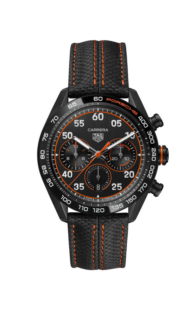 44mm H02, black dial with orange accents, Porsche Special Edition, black strap w/ orange stitching
