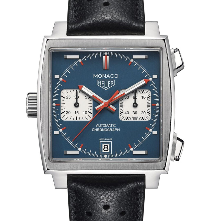 The Monaco proves that it’s hip to be square and the Monaco has been hip since it appeared on Steve McQueen’s wrist in the movie Le Mans in 1969. This waterproof chronograph deploys a sky-blue dial with silver counters for chronograph minutes and chronograph hours. Under the hood beats the mythic Calibre 11 movement. The black calfskin leather strap has a special finish, evoking a racetrack surface.