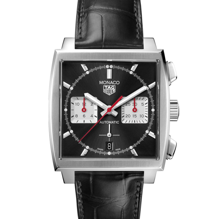 Steve McQueen’s watch in an all-black edition, this new TAG Heuer Monaco gets silver square minute and hour chronograph counters, with an alligator strap. The 39 mm fine-brushed, polished steel case is protected by the iconic bevelled sapphire crystal. The red lacquered central hand gives the design extra punch. Water resistant to 100 meters.