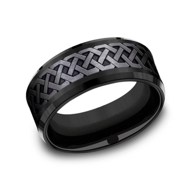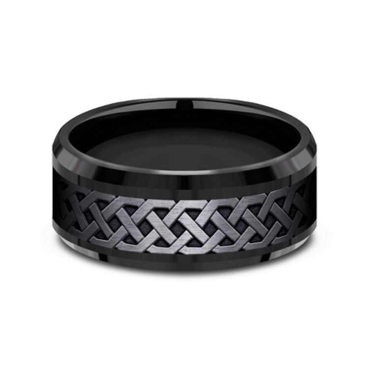 9mm, Comfort fitBlack TitaniumCeltic knot patterned center, bevel edges