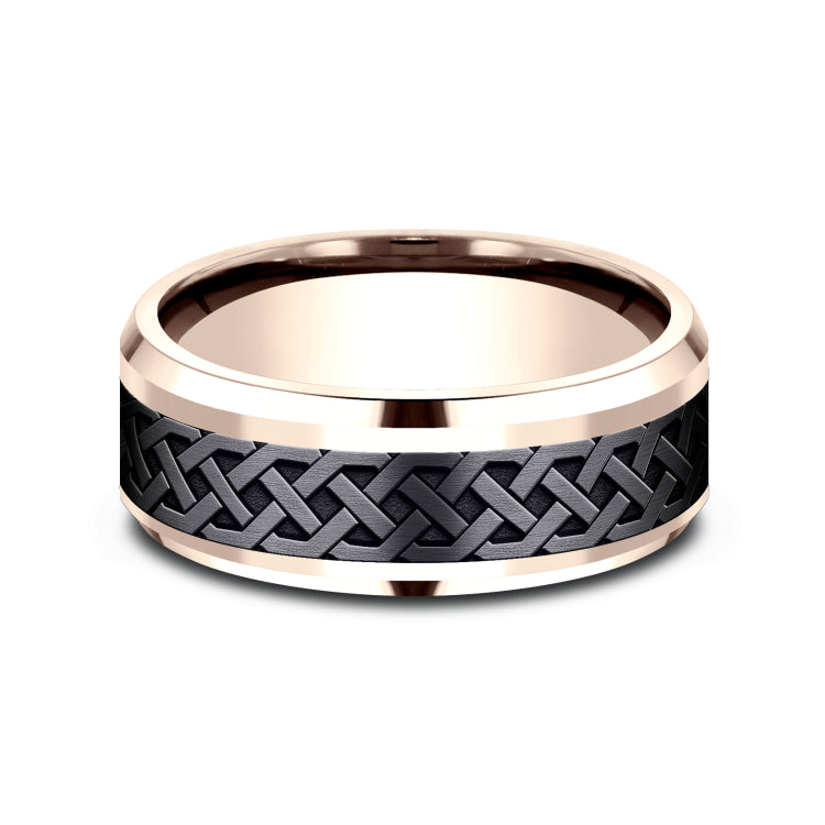 8mm, Comfort fit14K Rose Gold and Black TitaniumCeltic knot patterned center, polished bevel edges