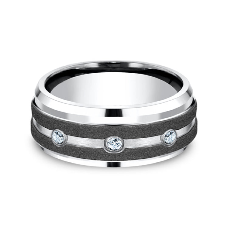 9mm, Comfort fitWhite CobaltGraphite stripes, center diamonds with bevel edges3 burnish set diamondsCarat weight is .20ctClarity SI1-2, Color GH