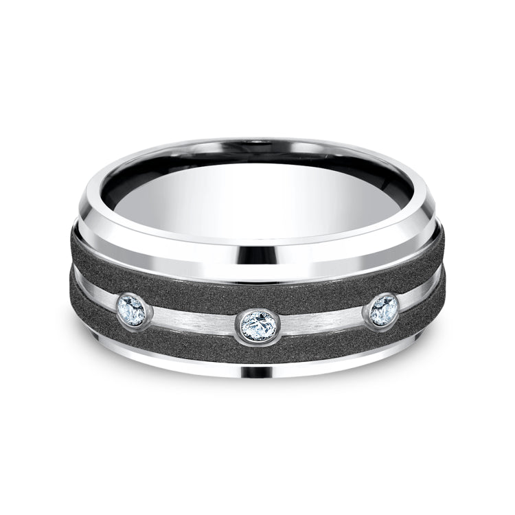 9mm, Comfort fit White Cobalt Graphite stripes, center diamonds with bevel edges 3 burnish set diamonds Carat weight is .20ct Clarity SI1-2, Color GH