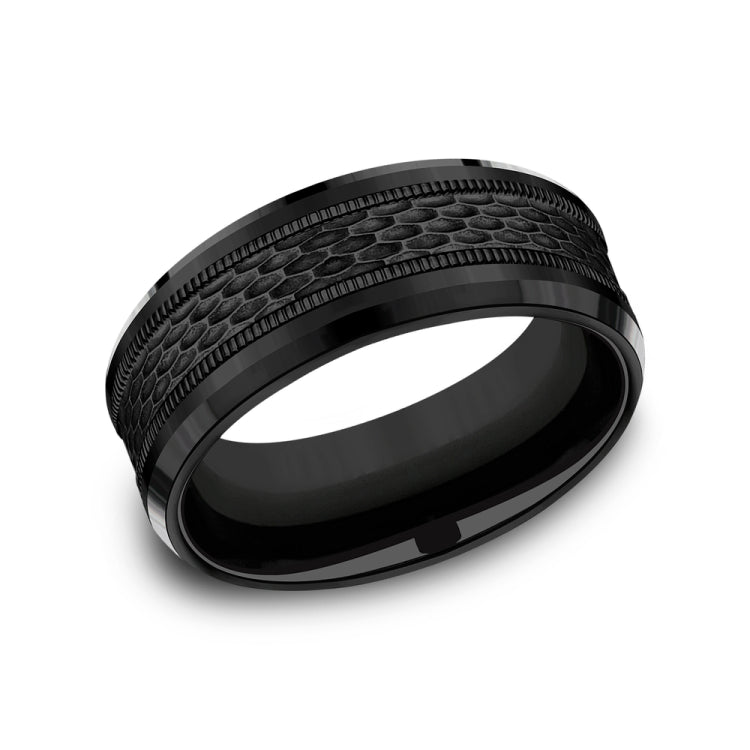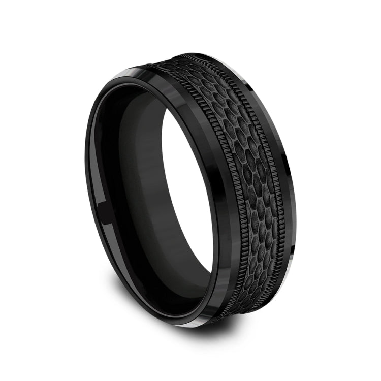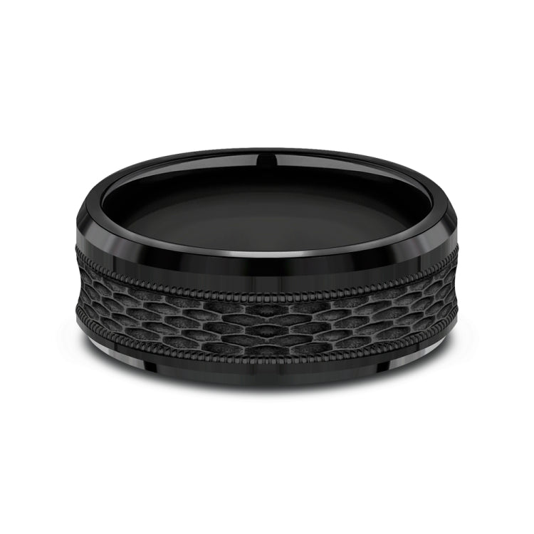 8mm, Comfort fitBlack TitaniumMesh pattern with milgrain detail, polished bevel edges