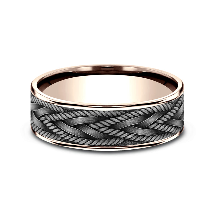 7.5mm, Comfort fit14K Rose Gold and Grey TantalumRope and wheat knot braid pattern, thin edges
