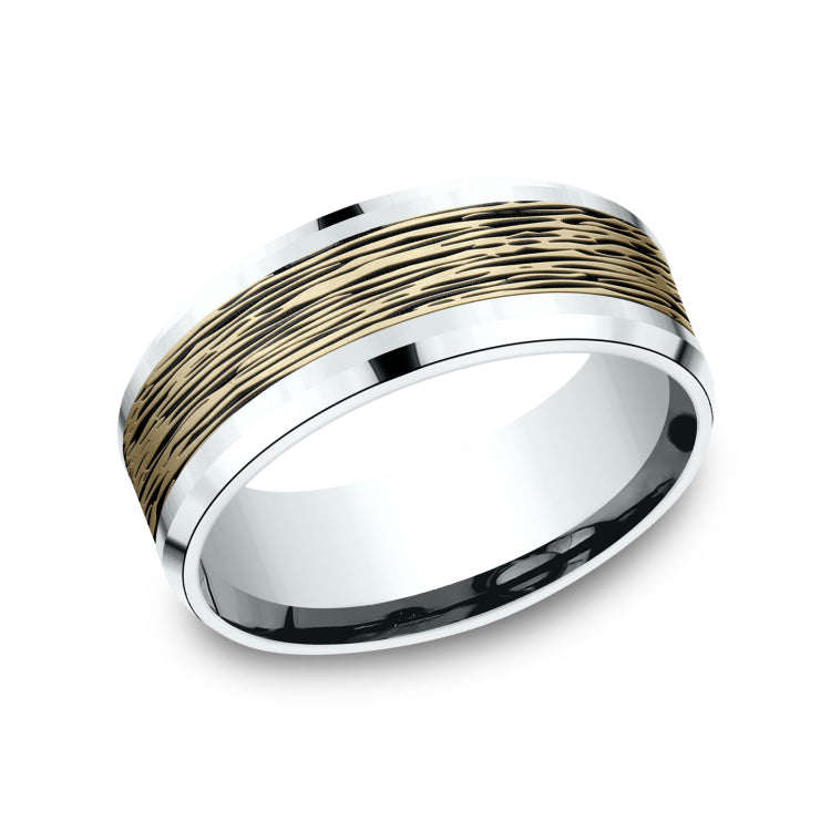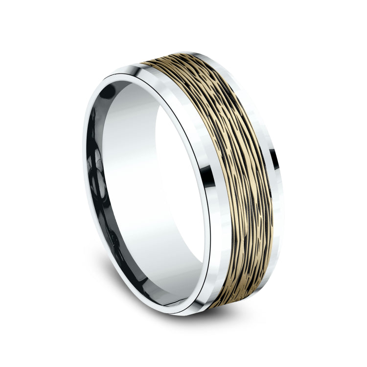 8mm, Comfort fit14K White and Yellow GoldHorizontal bark pattern, polished bevel edges