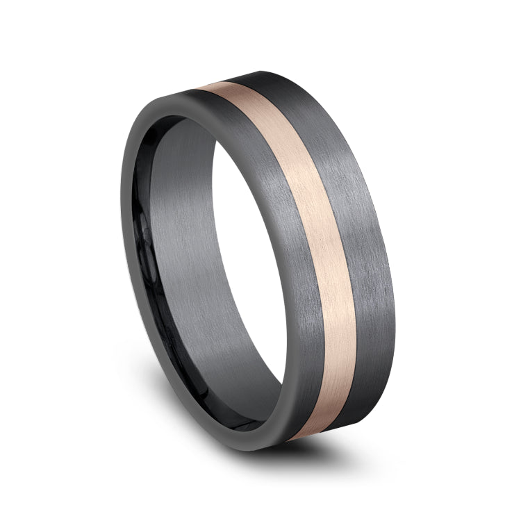 7mmDarkened Tantalum and 14K Rose GoldSatin finish with an offset stripe