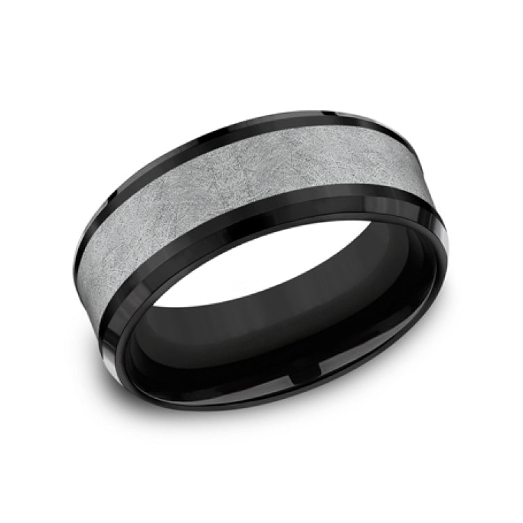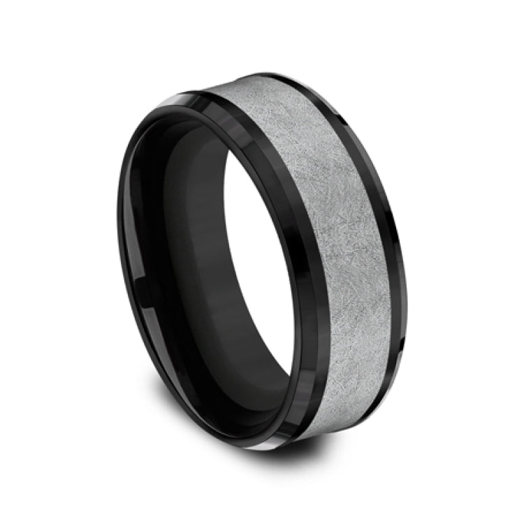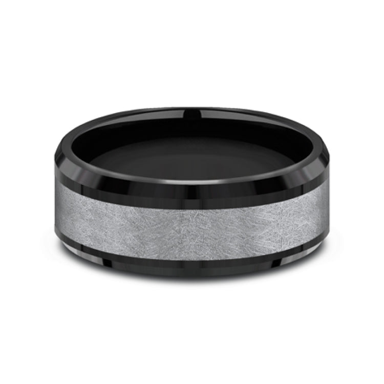 8mm, Comfort fitBlack Titanium and Grey Tantalum Swirl center, polished drop bevel edges