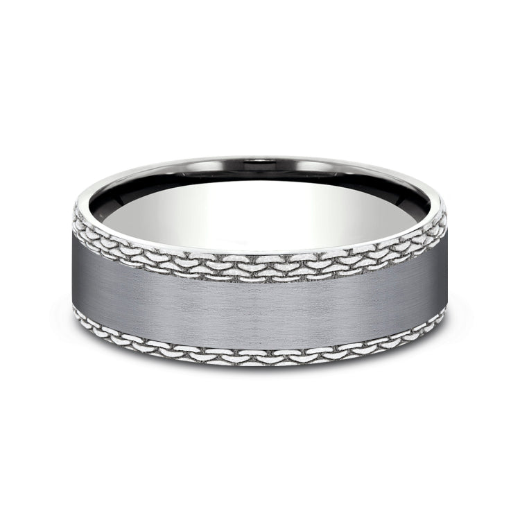 7mm, Comfort fit Grey Tantalum and 14K White Gold Satin center, chain link patterned edges