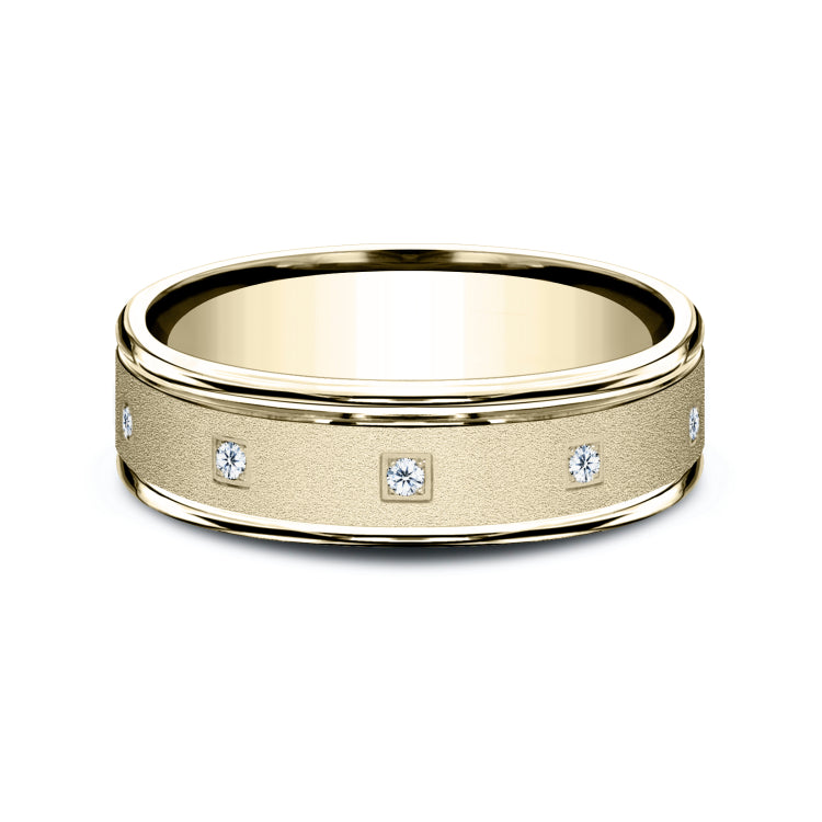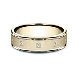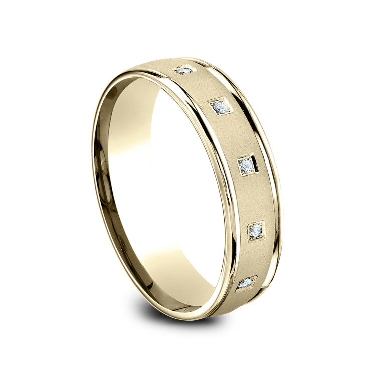 6mm, Comfort fit14K Yellow GoldSatin center, polished round edges12 pave set diamondsCarat weight is .12ctClarity SI1-2, Color GH