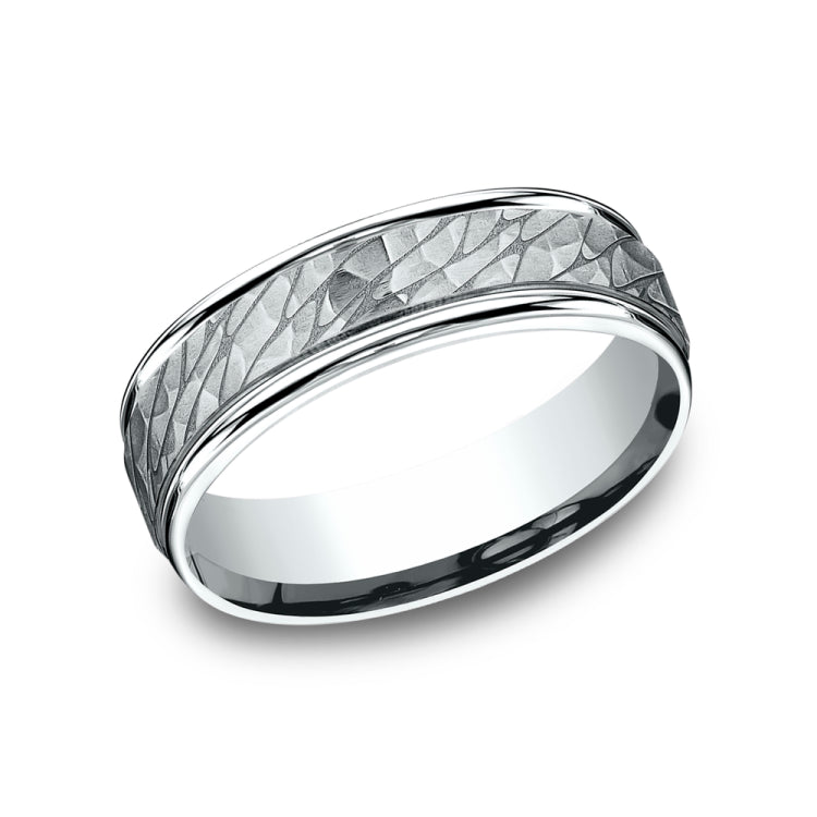 6.5mm, Comfort fit14K White GoldPebble pattern with hammered finish, polished round edges