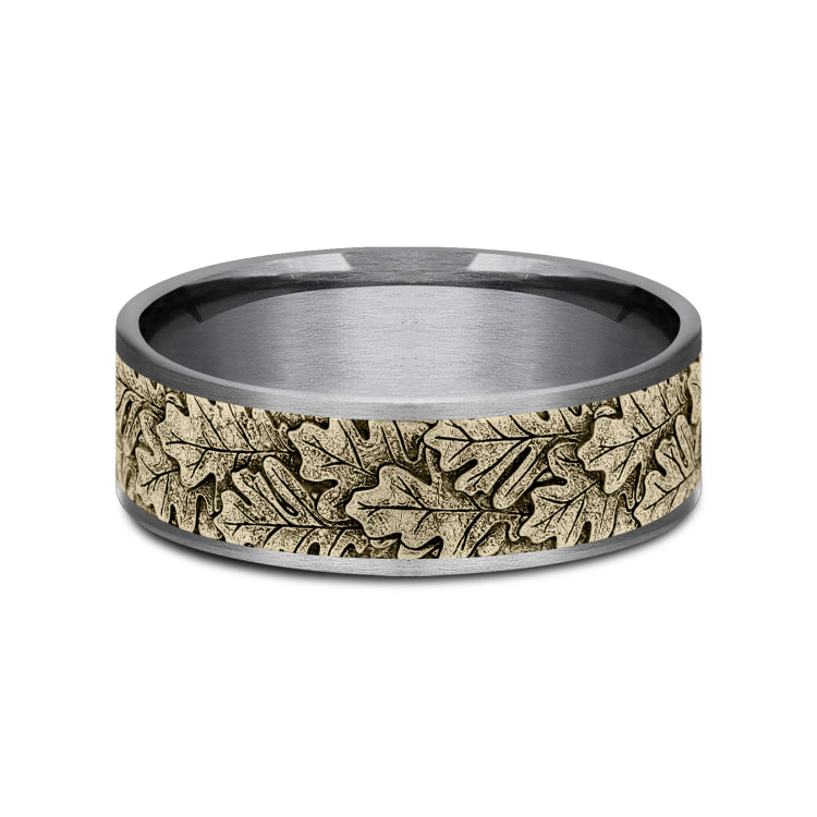 7.5mm, Comfort fit Grey Tantalum and 14K Yellow Gold Oak leaf pattern, thin edges