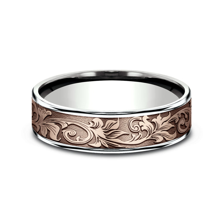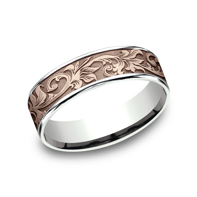 6.5mm, Comfort fit14K White and Rose GoldVintage script pattern, thin edges