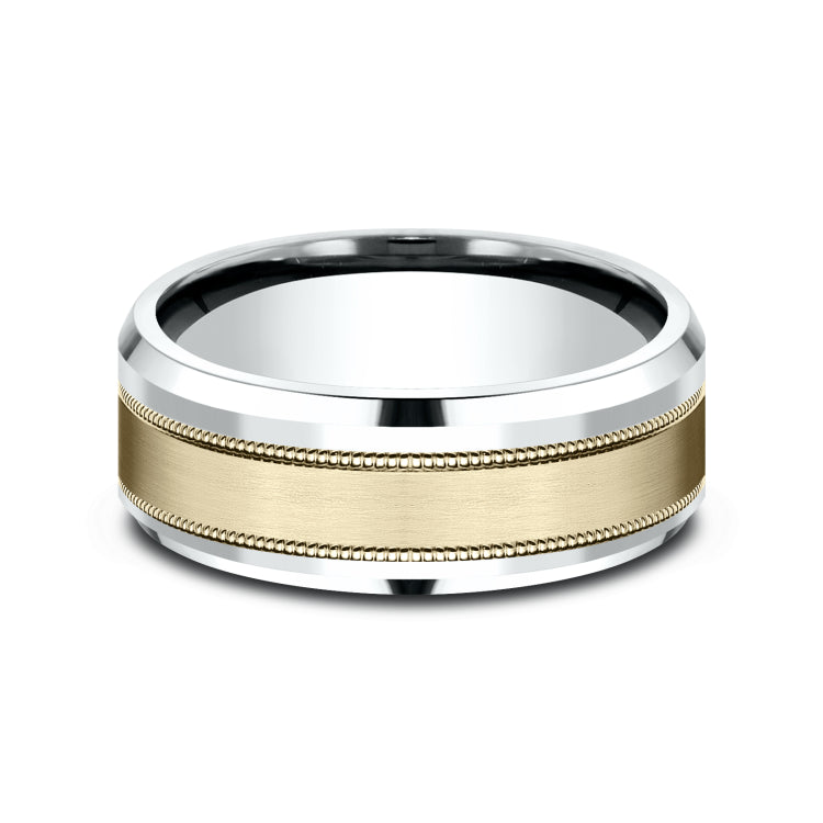 Satin center, milgrain detailing, polished bevel edges