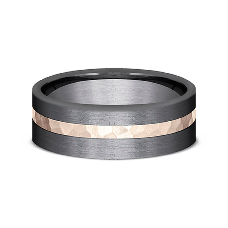 7mmDarkened Tantalum and 14K Rose GoldHammer finished offset stripe