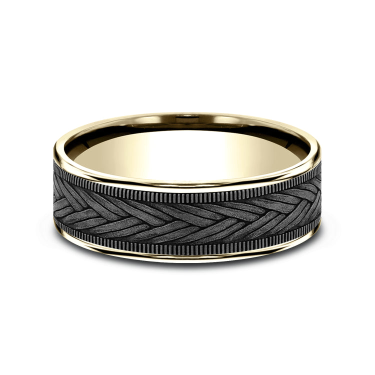 7.5mm, Comfort fit14K Yellow Gold and Grey TantalumWheat weave pattern, thin edges