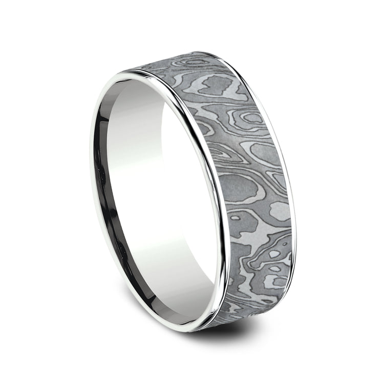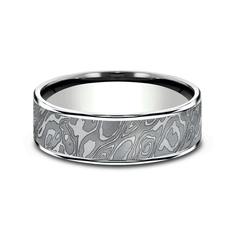 7.5mm, Comfort fit14K White Gold and Grey TantalumUnique Tamascus designed center, thin edges